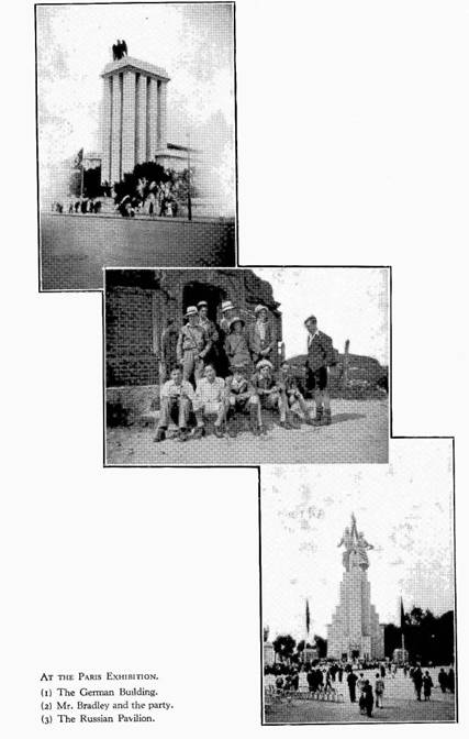 Stretched before us lay the Exhibition. Straight in front the Eiffel Tower, built for the Exhibition of 1887, on the right the Russian Pavilion, surmounted by two huge figures of a young man and woman holding a hammer and sickle. On the left the German Pavilion, from the top of which the German eagle looked out ; and in the distance the domed roof of the Invalides, resting place of Napoleon, gleamed in the hot sun.
