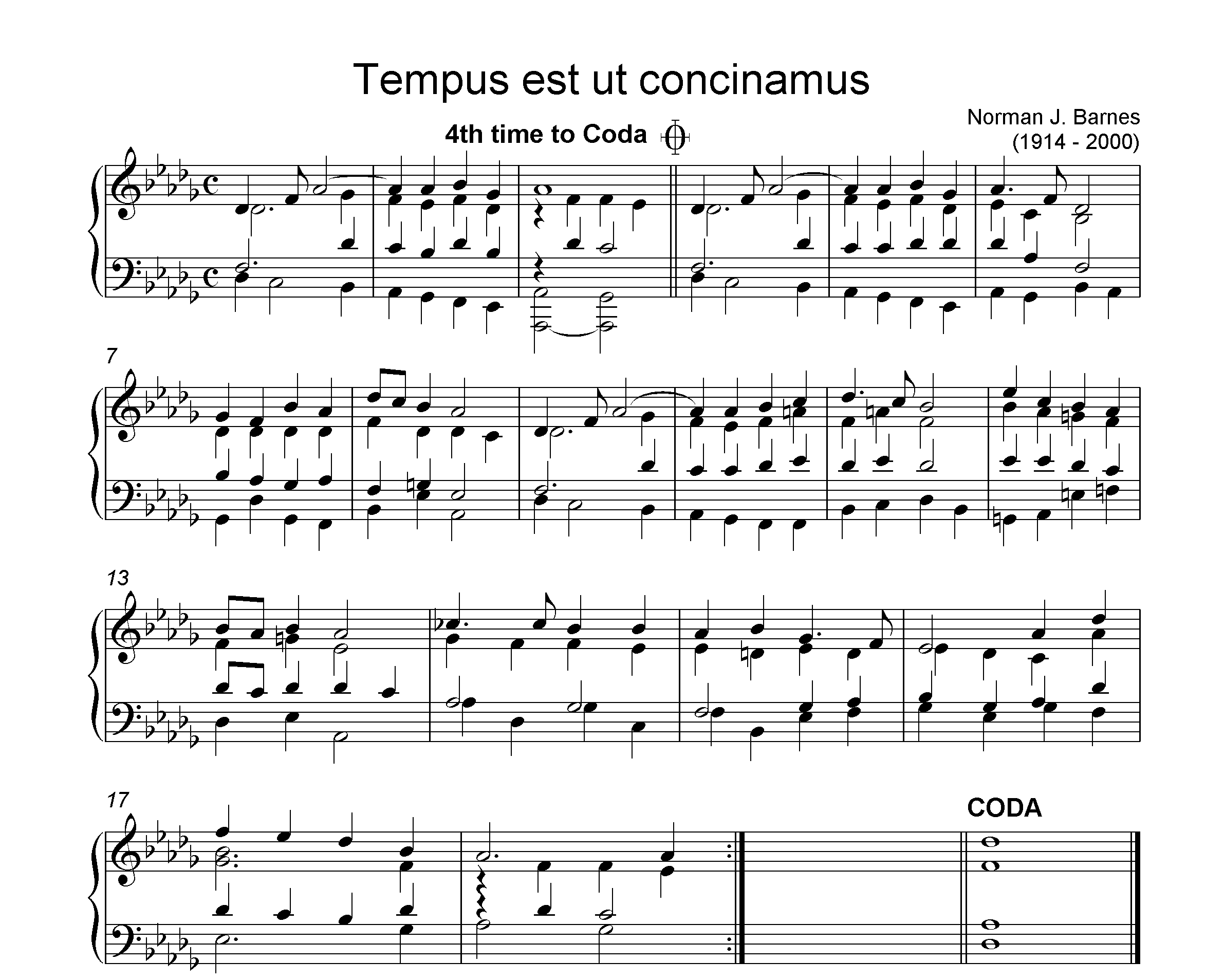 "As the recording currently stands, it plays more-or-less in the key of C major, but I’m pretty sure the original was in D flat: I suspect, therefore, that Norman was playing it on a piano which was very flat. My transcription is pretty much what he plays and allows for slight variations between verses and negotiates some (very) tiny slips which he makes. I’m sure the original would have had an organ pedal part and the melody line would also have been written separately. I well remember Enjaybee’s insistence that the last note of each verse should be held for five beats! I haven’t tried to reproduce that here. Also, musicians may remember that Norman was always very proud of the progression of “secondary sevenths” which appear in bars 14 and 15.